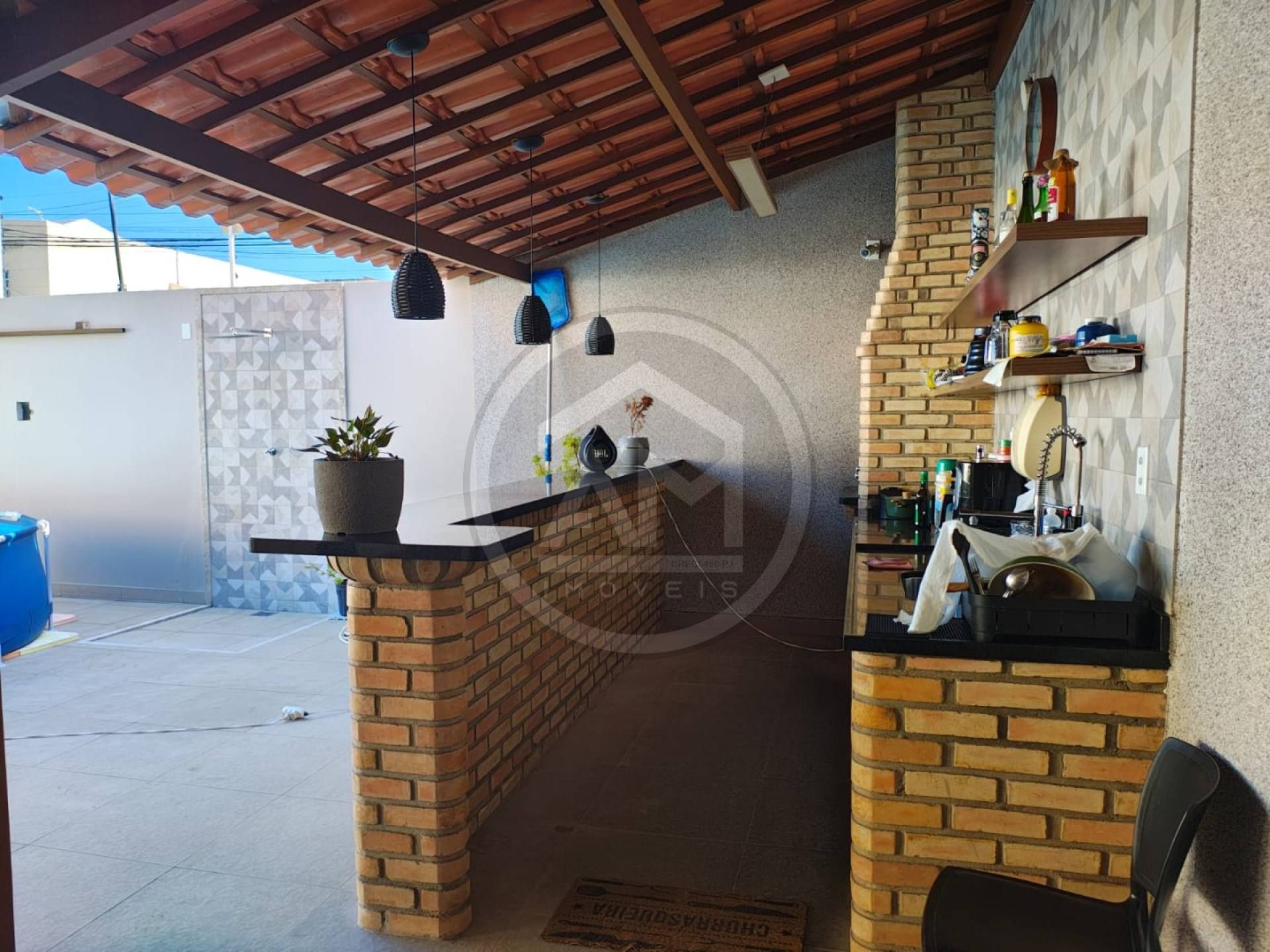 Área gourmet completa com bancada, pia e churrasqueira