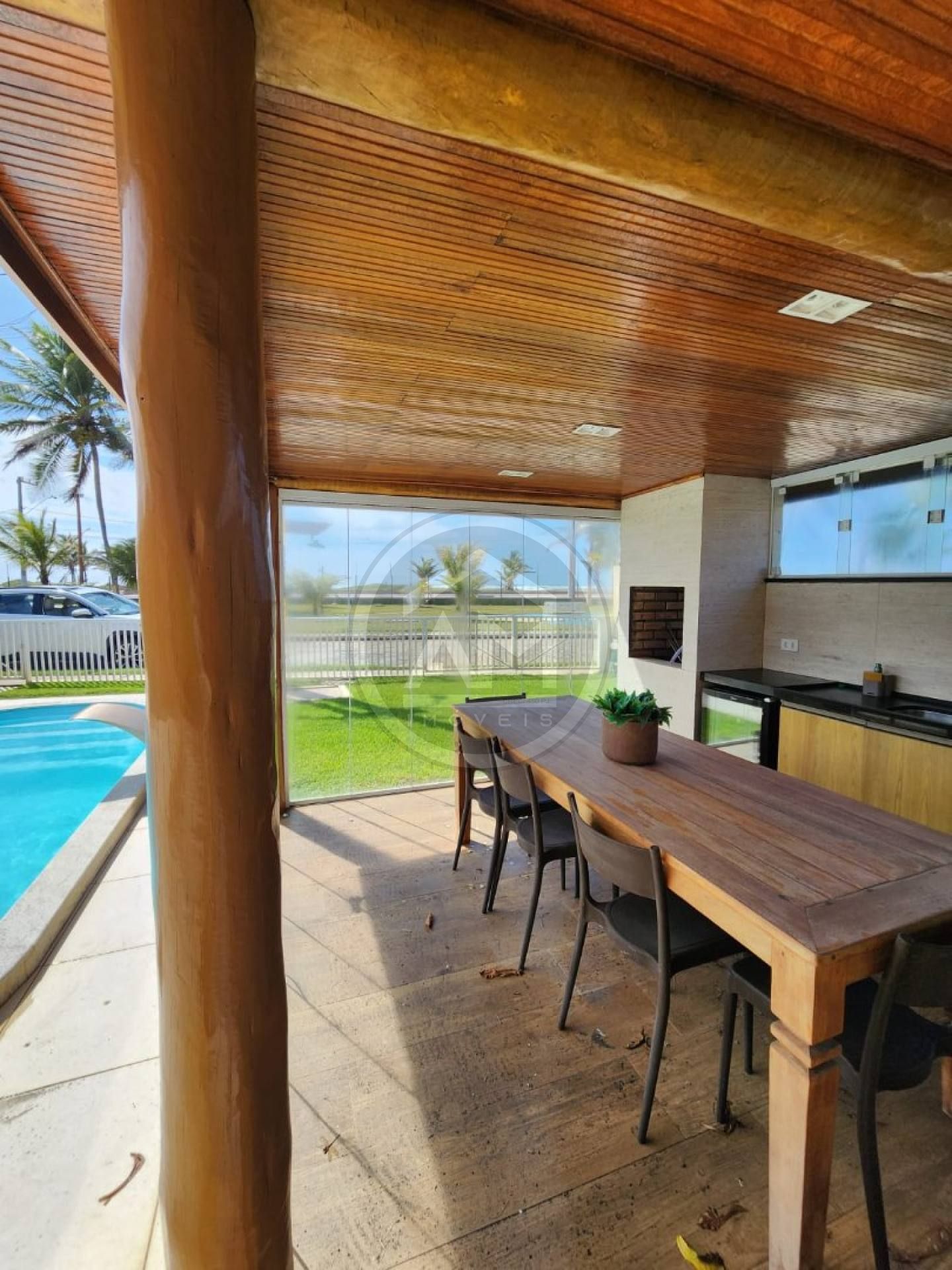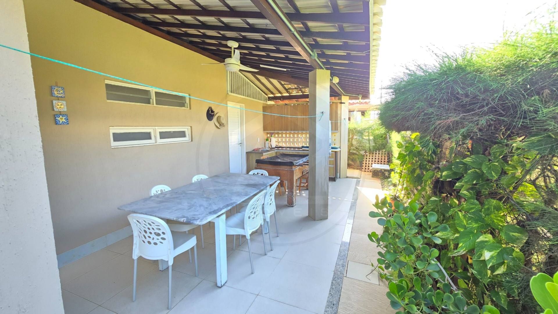 Varanda dos fundos com mesa de granito, cadeiras e armários;