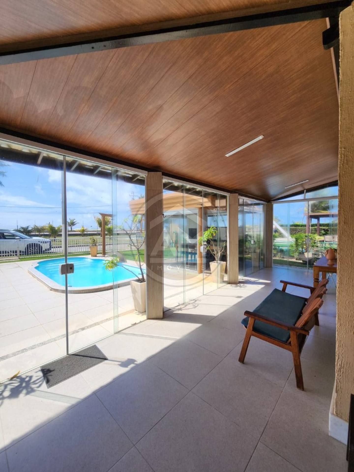 Varanda frente forrada com fechamento em vidro;