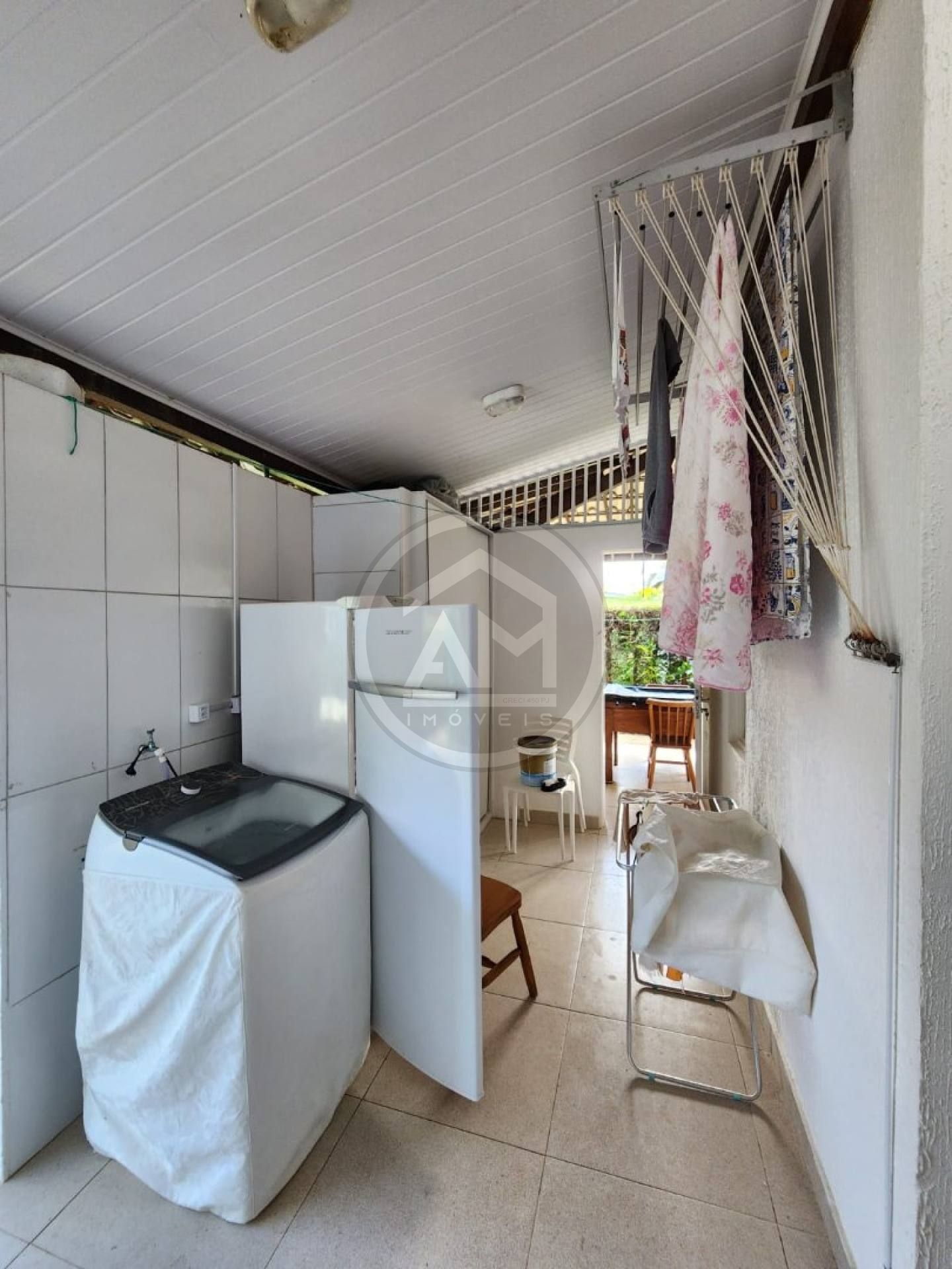 Área de serviço com máquina de lavar, freezer vertical e armário embutido;
