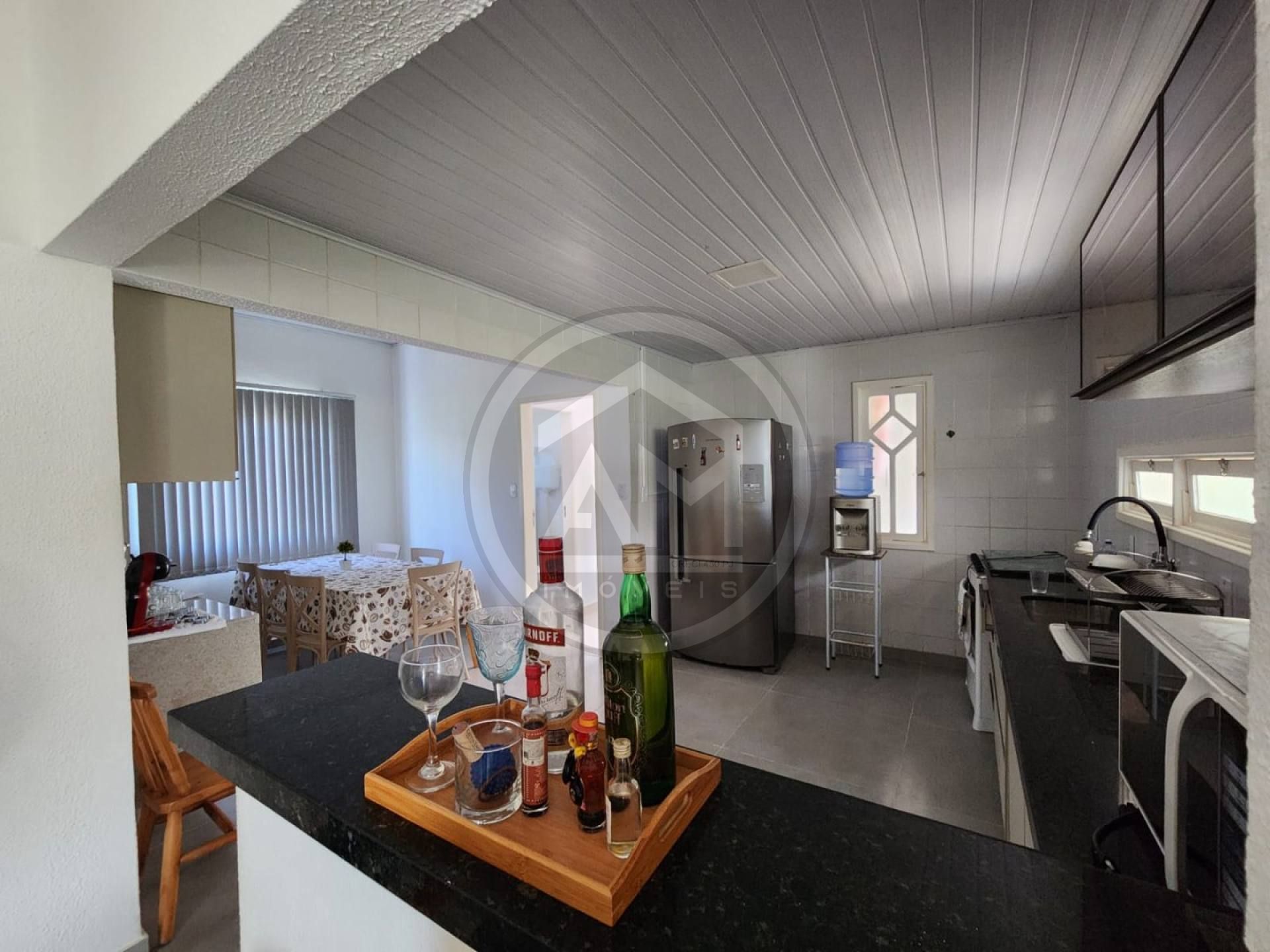 Copa/Cozinha com armários, mesa, cadeiras, fogão cooktop 5 bocas, refrigerador com freezer, micro-ondas e filtro;