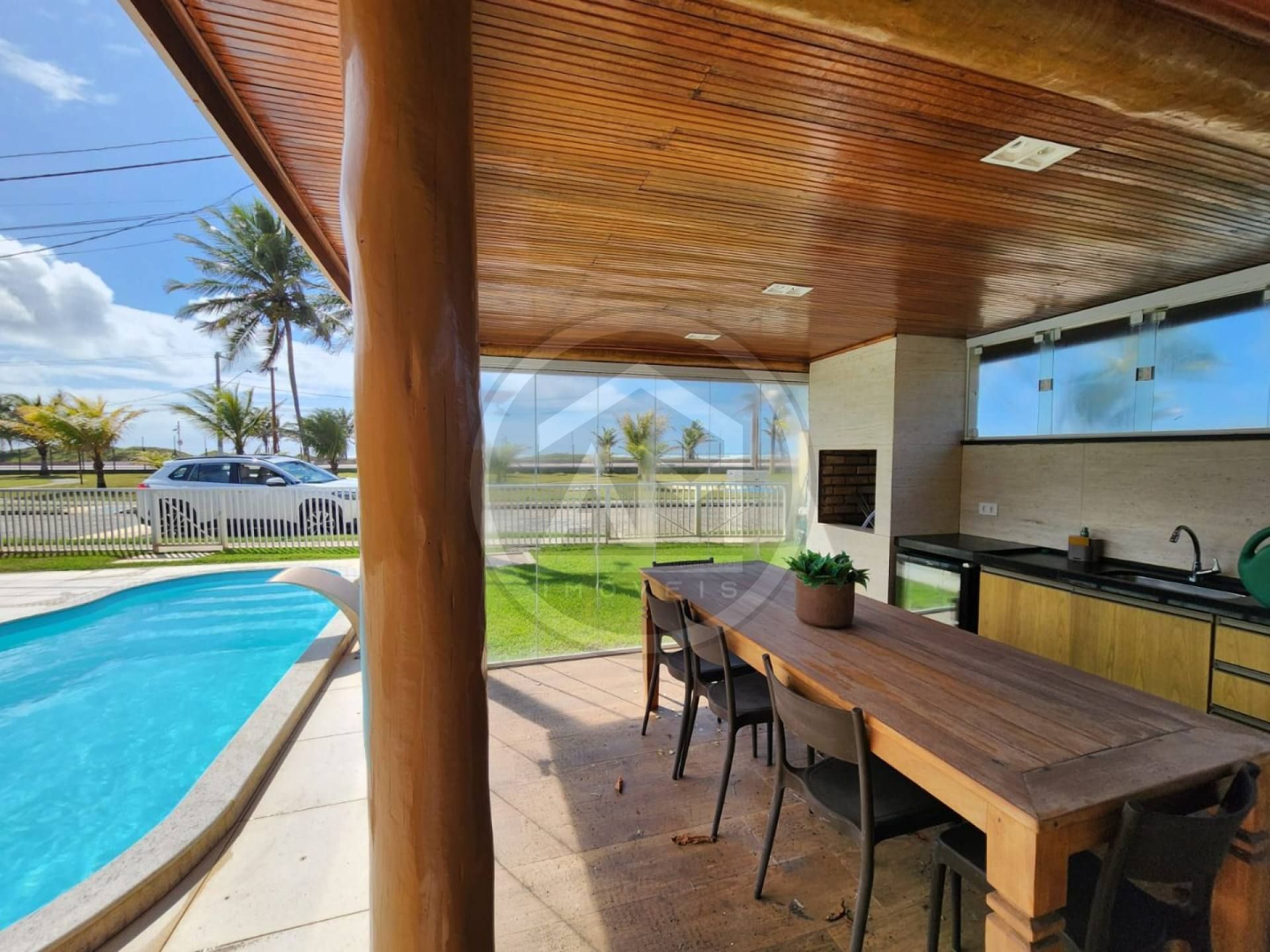 Quiosque com churrasqueira, pia e cervejeira;